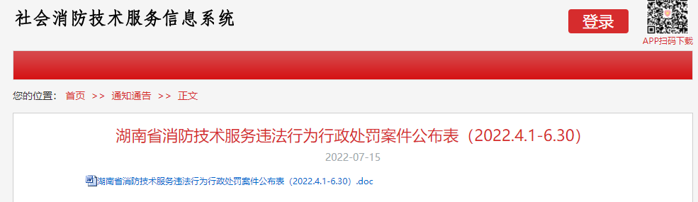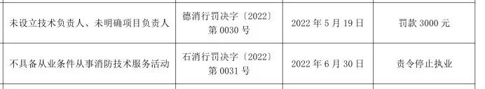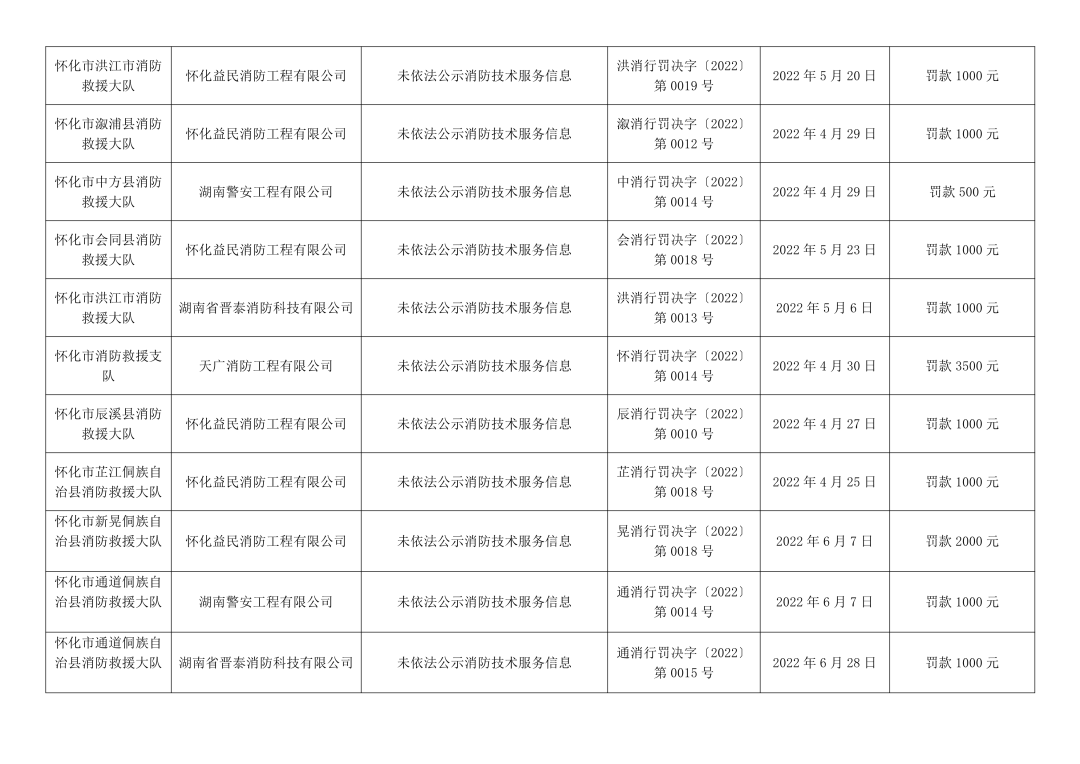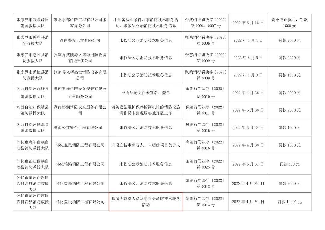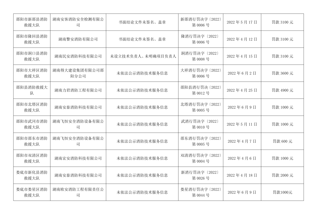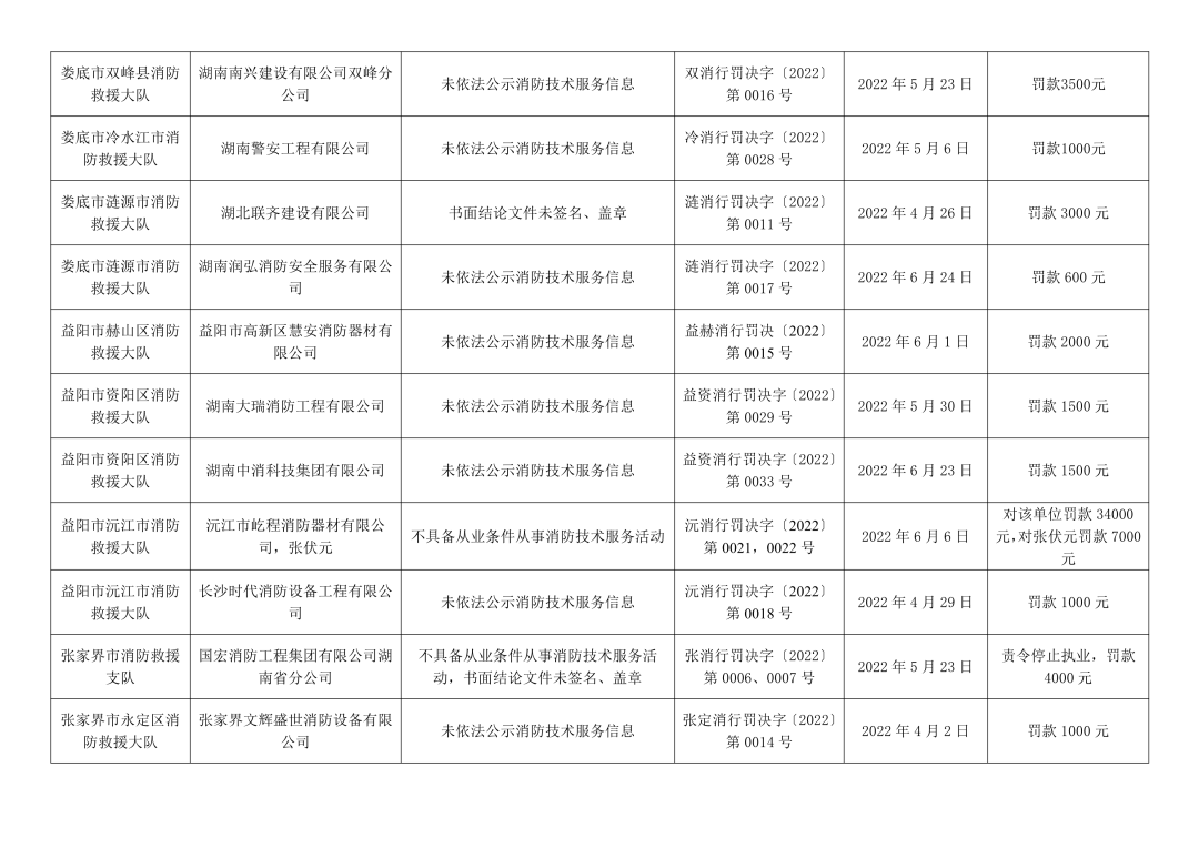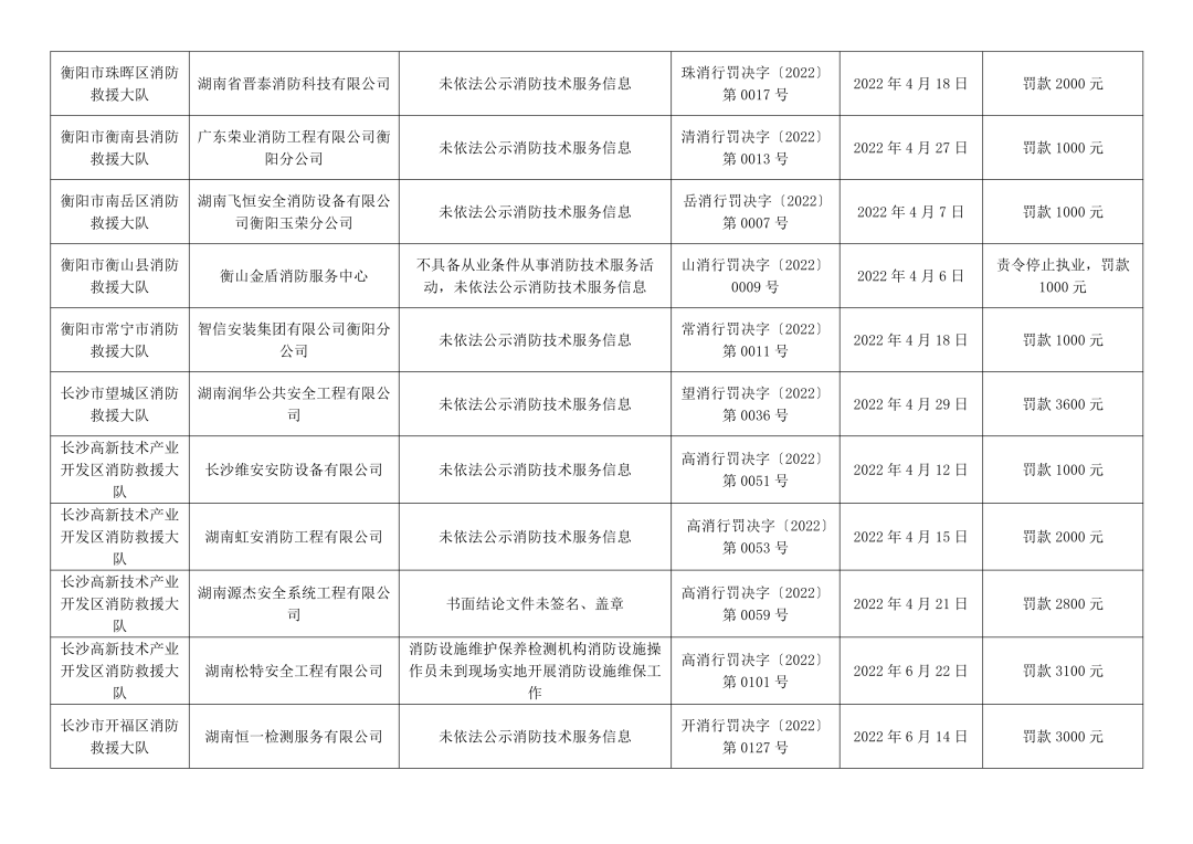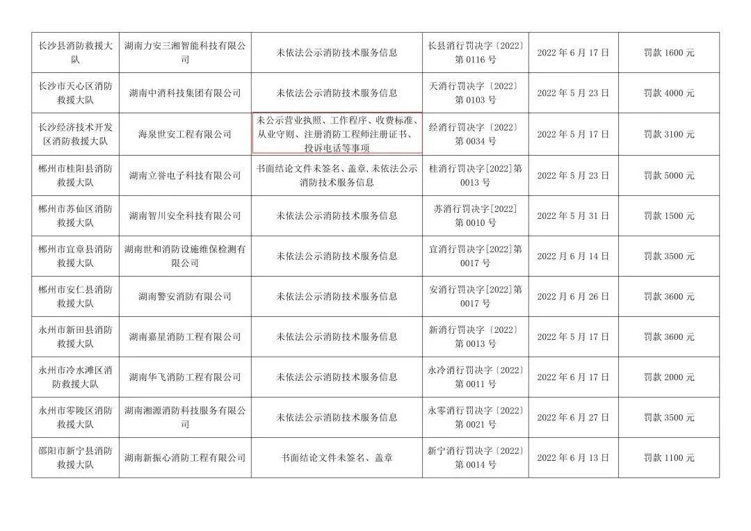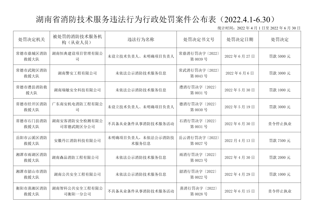湖南省消防技術(shù)服務(wù)違法行為行政處罰案件公布表(2022.4.1-6.30)